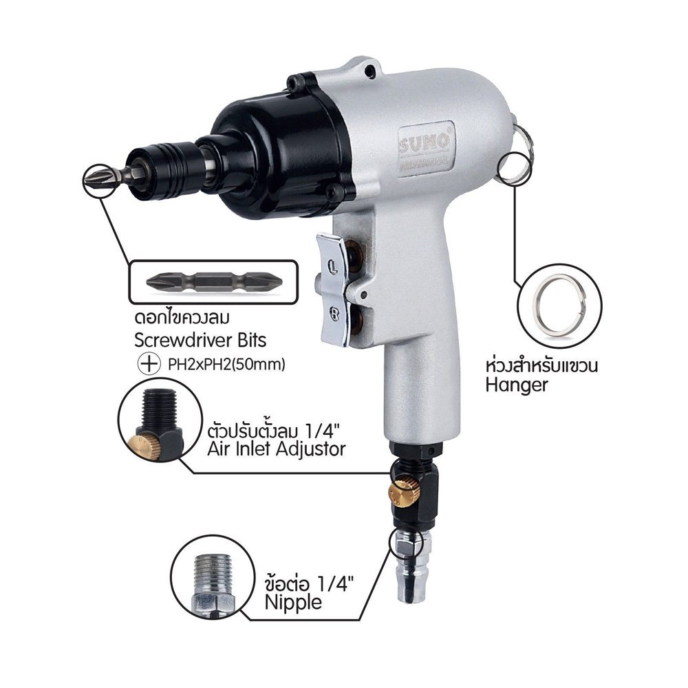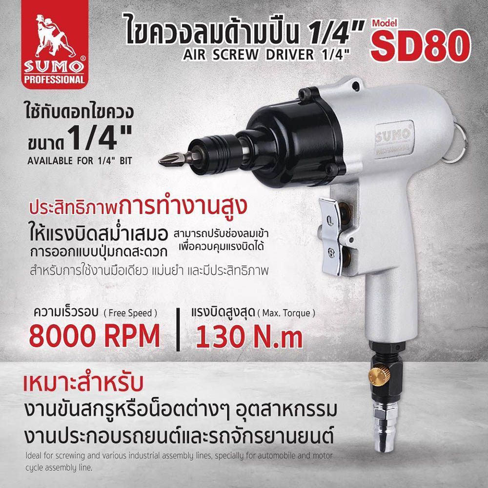 SUMO ไขควงลมด้ามปืน ขนาด 1/4 นิ้ว แรงบิด 130Nm ความเร็วรอบ 8000 RPM รุ่น SD80 ประสิทธิภาพการทำงานสูงให้แรงบิดสม่ำเสมอ