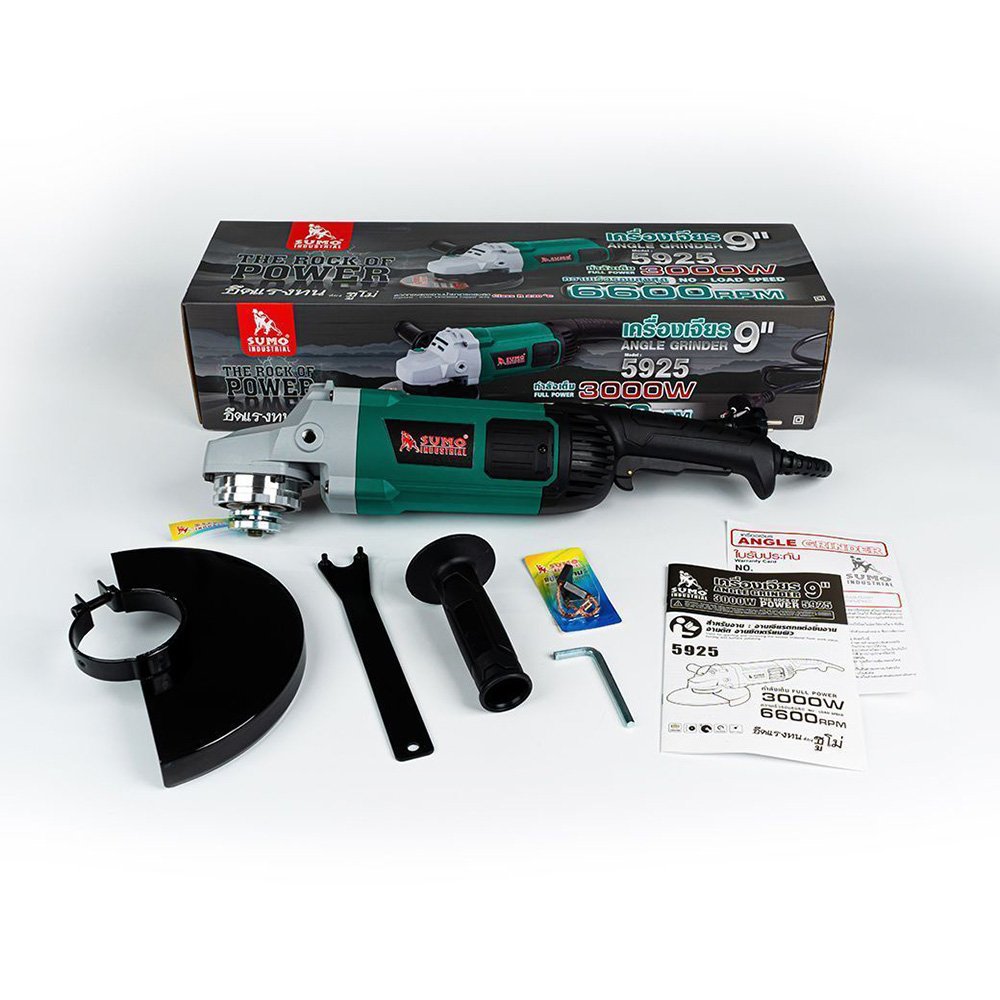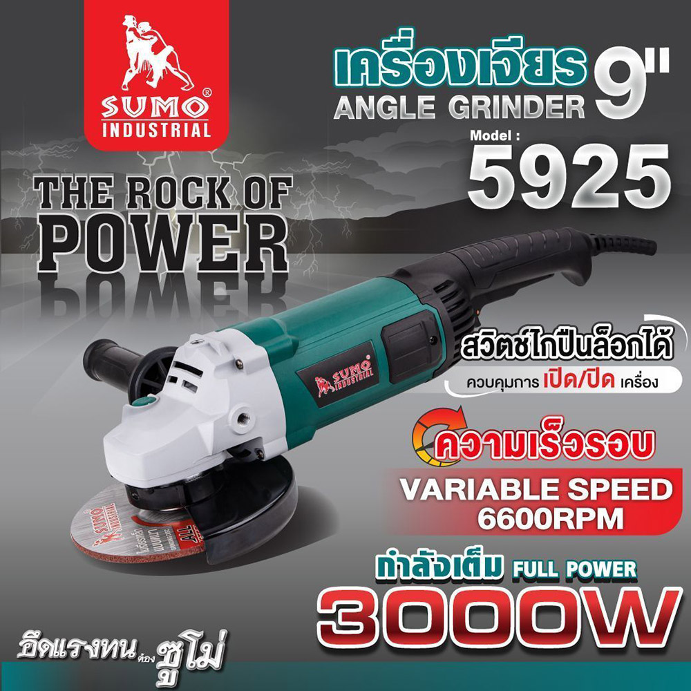 SUMO เครื่องเจียร ขนาด 9 นิ้ว รุ่น 5925 แรงบิดสูงสุด กำลังไฟเต็มกำลัง 3000 วัตต์ ความเร็วรอบ 6600 รอบ/นาที สายไฟยาว 2 เมตร