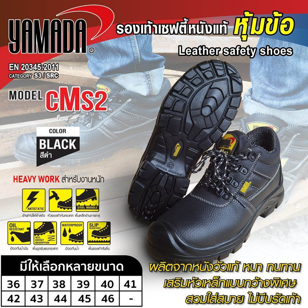 YAMADA รองเท้าเซฟตี้หนังแท้หุ้มข้อหัวเหล็ก รุ่น CMS2 Safety shoes (black) ผลิตจากหนังวัวแท้ พื้น PU กันน้ำ เสริมหัวเหล็กรับแรงกระแทกได้ 200 จูล