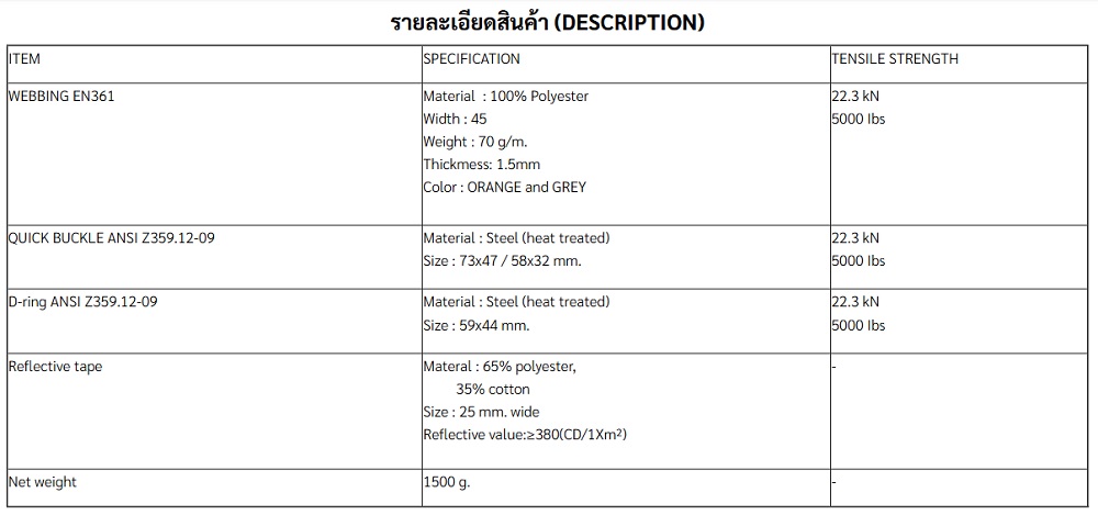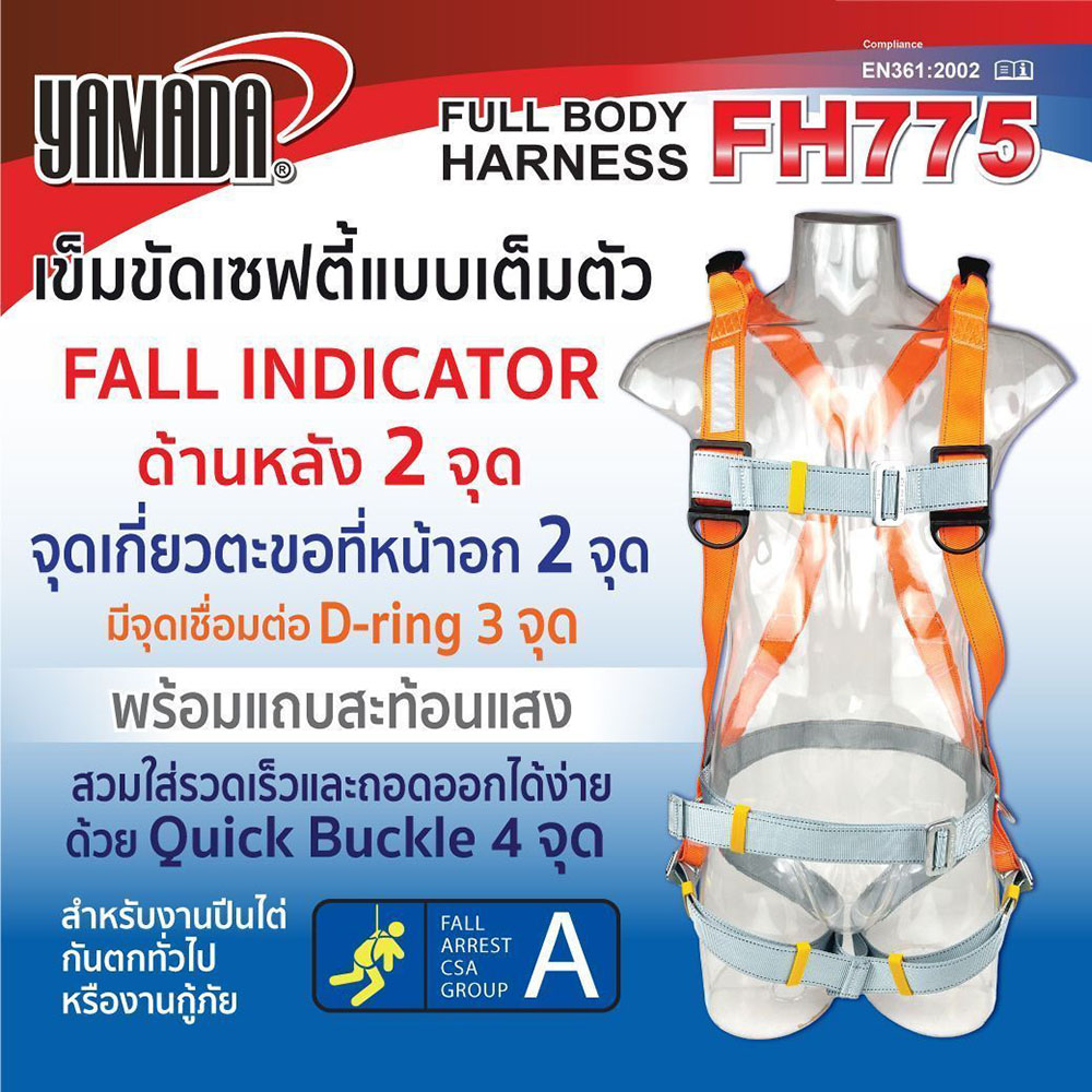 YAMADA เข็มขัดเซฟตี้เต็มตัว รุ่น FH775 โพลีเอสเตอร์ 100% มีแถบสะท้อนแสง รับน้ำหนักได้มากถึง 22.3 kN (2,273 Kg.) มาตรฐาน CE EN361:2002