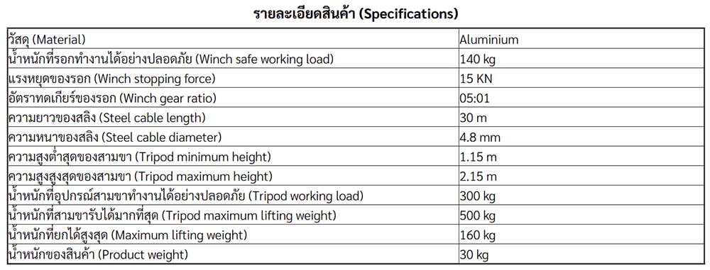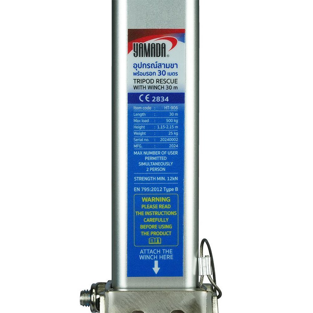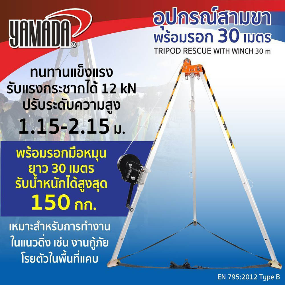 YAMADA อุปกรณ์สามขาพร้อมรอก 30 เมตร รุ่น HT-906 รับน้ำหนักได้ 150 Kg. ความสูงปรับได้ 1.15-2.15 เมตร มีกำลังดึง 12 kN มาตรฐาน EN1496:2017