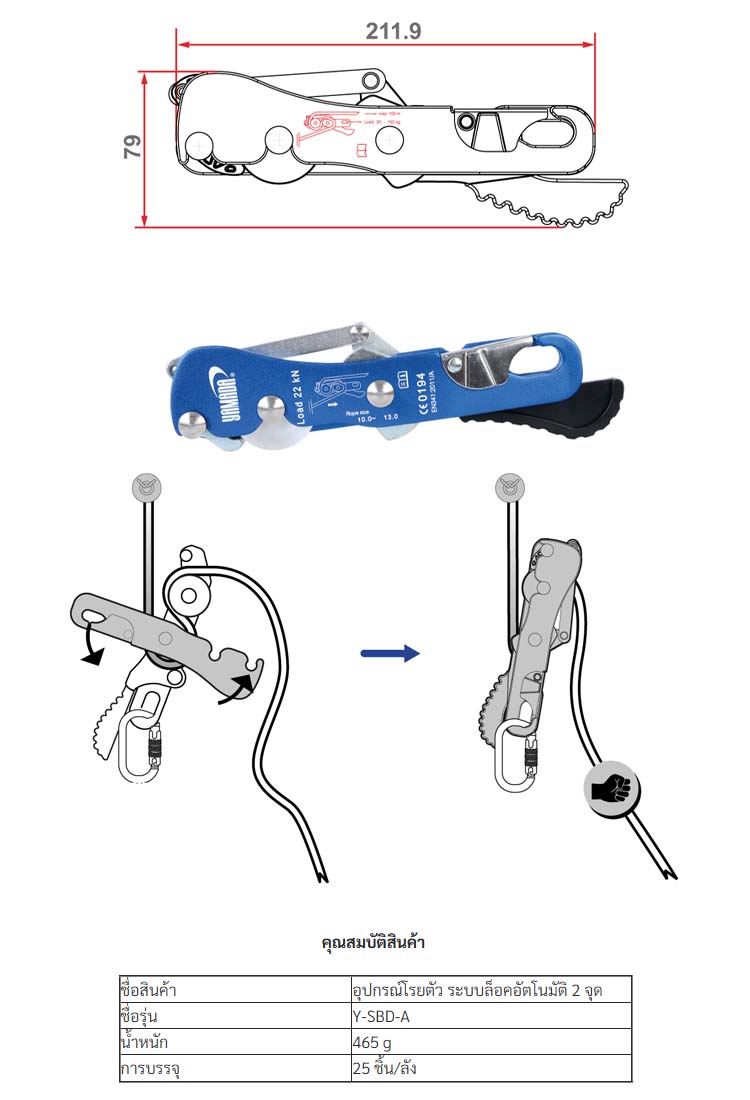 อุปกรณ์โรยตัวระบบล็อคอัตโนมัติ 2 จุด รุ่น Y-SBD-A รับน้ำหนักแรงดึงสูงสุดได้ 2 ตัน ใช้กับเชือก 10-13 มิลลิเมตร สำหรับโรยตัว และกู้ภัยโดยการเคลื่อนย้าย