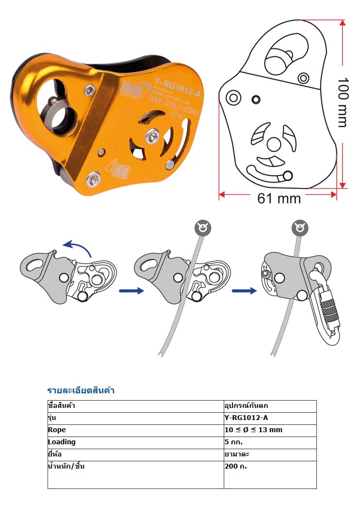 YAMADA อุปกรณ์กันตก รุ่น Y-RG1012-A ผลิตจากอลูมิเนียม แข็งแรง น้ำหนักเบา สามารถรับน้ำหนักได้สูงสุด 500 Kg. ใช้งานกับเชือกที่มีขนาด 10-13 mm.