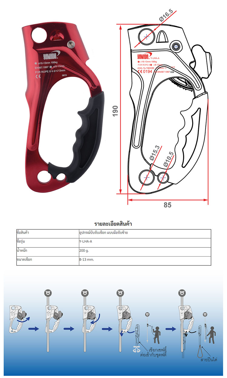 YAMADA อุปกรณ์บีบจับเชือกมือซ้าย(สีแดง) รุ่น Y-LHA-A อุปกรณ์บีบจับเชือก มือจับซ้าย รับน้ำหนักได้ 400 Kg. ใช้กับเชือกที่มีขนาด 8-13 มม.