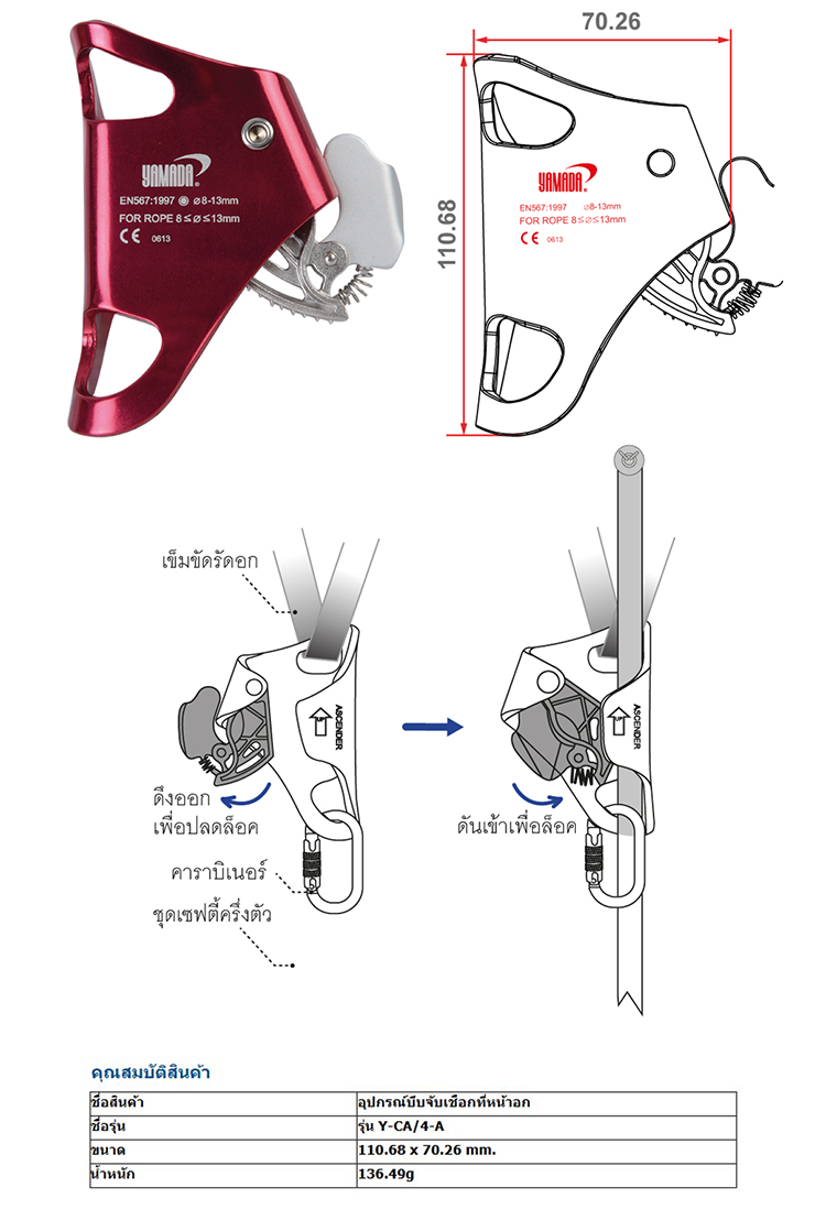 YAMADA อุปกรณ์บีบจับเชือกที่หน้าอก รุ่น Y-CA/4-A ช่วยจับยึดเชือกสำหรับการไต่ขึ้นเชือก ใช้กับเชือกขนาด 8-13 mm. รับน้ำหนักได้ 400 Kg.