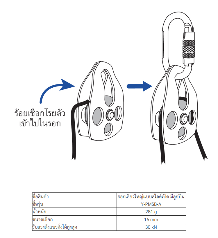 YAMADA รอกเดี่ยวใหญ่แบบสไลด์เปิด มีลูกปืน รุ่น Y-PMSB-A ทำจากอลูมิเนียม ใช้กับเชือกขนาด 16 mm. รับแรงดึงแนวดิ่งได้สูงสุด 30 kN