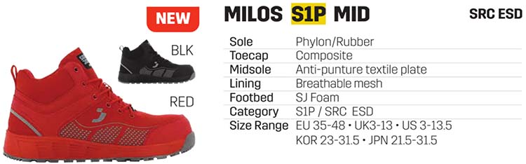 SAFETY JOGGER รองเท้าเซฟตี้หุ้มข้อ หัวคอมโพสิต MILOS S1P MID ดูดซับแรงกระแทกที่ส้นเท้า และปลายเท้า ดีไซน์สปอร์ตทันสมัย แผ่นใยกันทะลุ น้ำหนักเบา