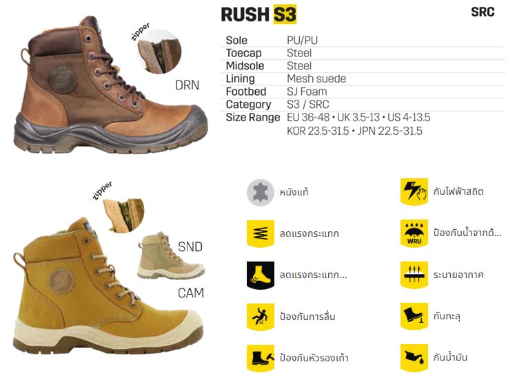 SAFETY JOGGER รองเท้าเซฟตี้หุ้มข้อ หัวเหล็ก RUSH S3 มีซิป สวมใส่คล่อง หุ้มส้นที่ป้องกันได้ถึงระดับสูงสุด ส่วนหนังด้านนอกกันน้ำเข้า
