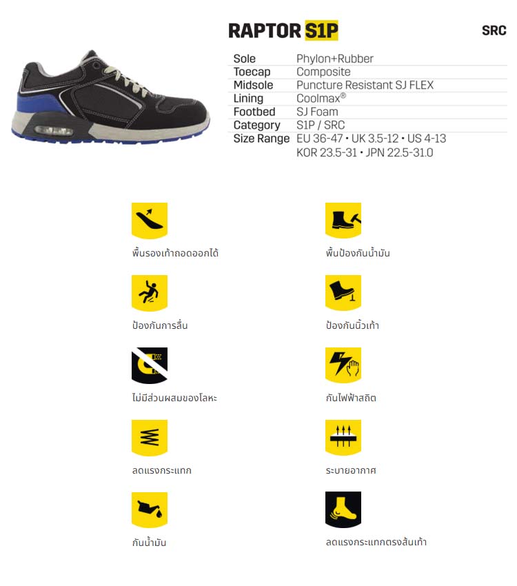 SAFETY JOGGER รองเท้าเซฟตี้หุ้มส้น หัวคอมโพสิต RAPTOR S1P มีแผ่นใยกันทะลุแบบเสื้อกันกระสุน มีระบบแอร์รองรับแรงกระแทกที่ส้นเท้า