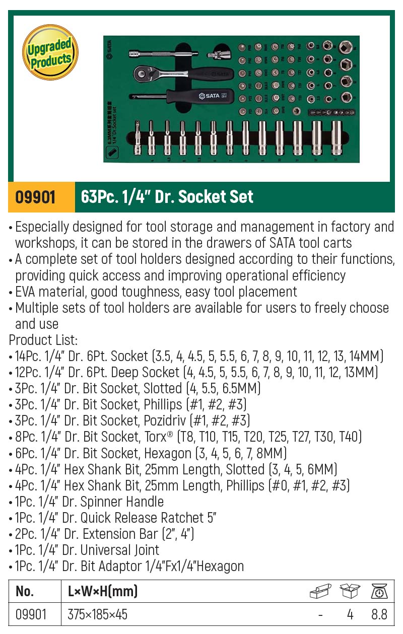 SATA ชุดถาดลูกบล็อกและด้ามฟรี 1/4" 63 ชิ้น รุ่น SATA 09901 เหมาะสำหรับเก็บในตู้เครื่องมือ วัสดุถาด EVA ทนทานต่อแรงกระแทก กันน้ำได้ และทนต่อรังสี UV