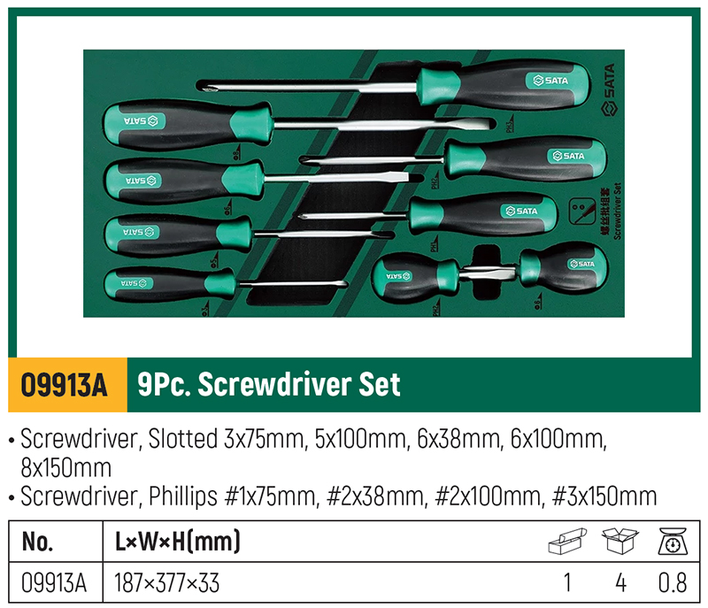 SATA ชุดถาดไขควง 9 ชิ้น รุ่น SATA 09913A ผลิตจากเหล็กอัลลอยด์ประสิทธิภาพสูง (CR-V) ออกแบบตามหลักสรีรศาสตร์ ด้ามจับที่ทนต่อน้ํามันและสารเคมี