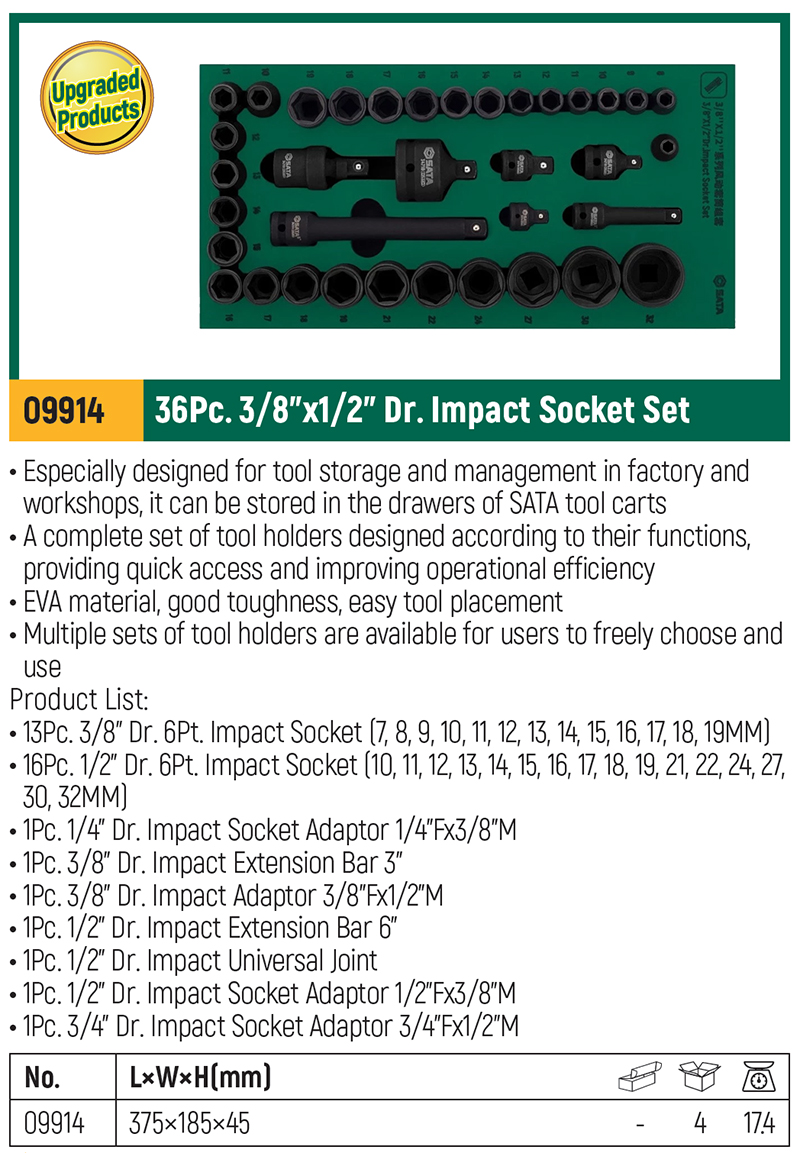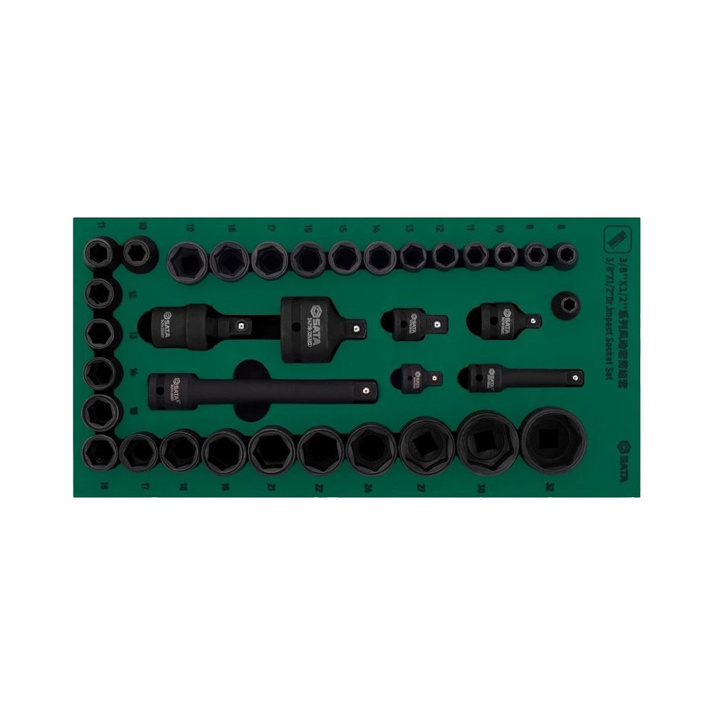 SATA ชุดถาดลูกบล็อกกระแทก 3/8"&1/2" จำนวน 36 ชิ้น SATA 09914 เหมาะสำหรับเก็บในตู้เครื่องมือ มาพร้อมถาดที่ทนทานสําหรับจัดเก็บและจัดระเบียบ วัสดุถาด EVA