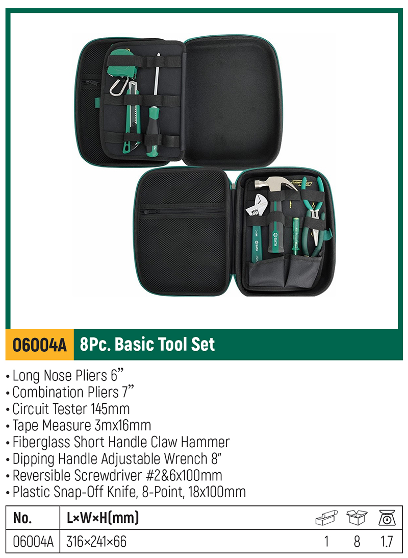SATA ชุดเครื่องมือช่างพื้นฐาน 8 ชิ้น SATA 06004A บรรจุในกระเป๋าเครื่องมือ พกพาสะดวก มีอุปกรณ์ให้เลือกใช้แบบครบครัน