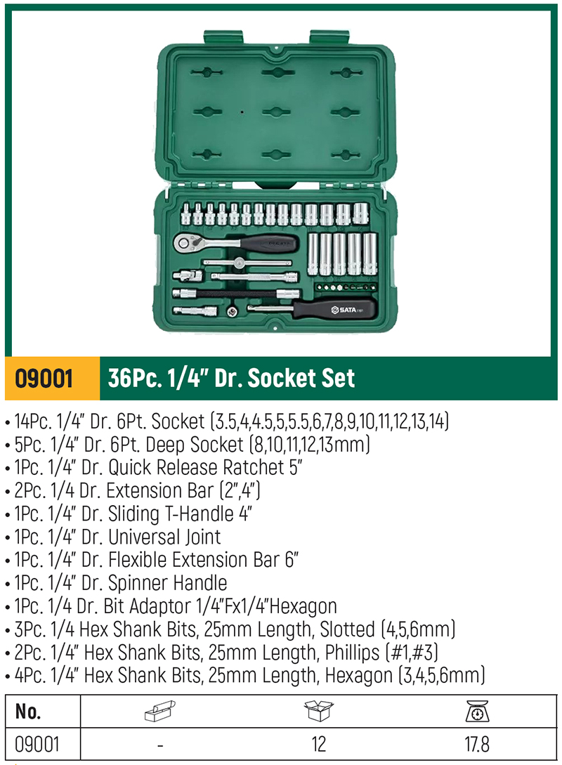 SATA ชุดบล็อก 1/4“ 36 ชิ้น ขนาด 3.5-14mm. รุ่น SATA 09001 บรรจุในกล่องพลาสติก แข็งแรงทนทาน พกพาสะดวก หยิบใช้งานได้ง่าย รวดเร็ว