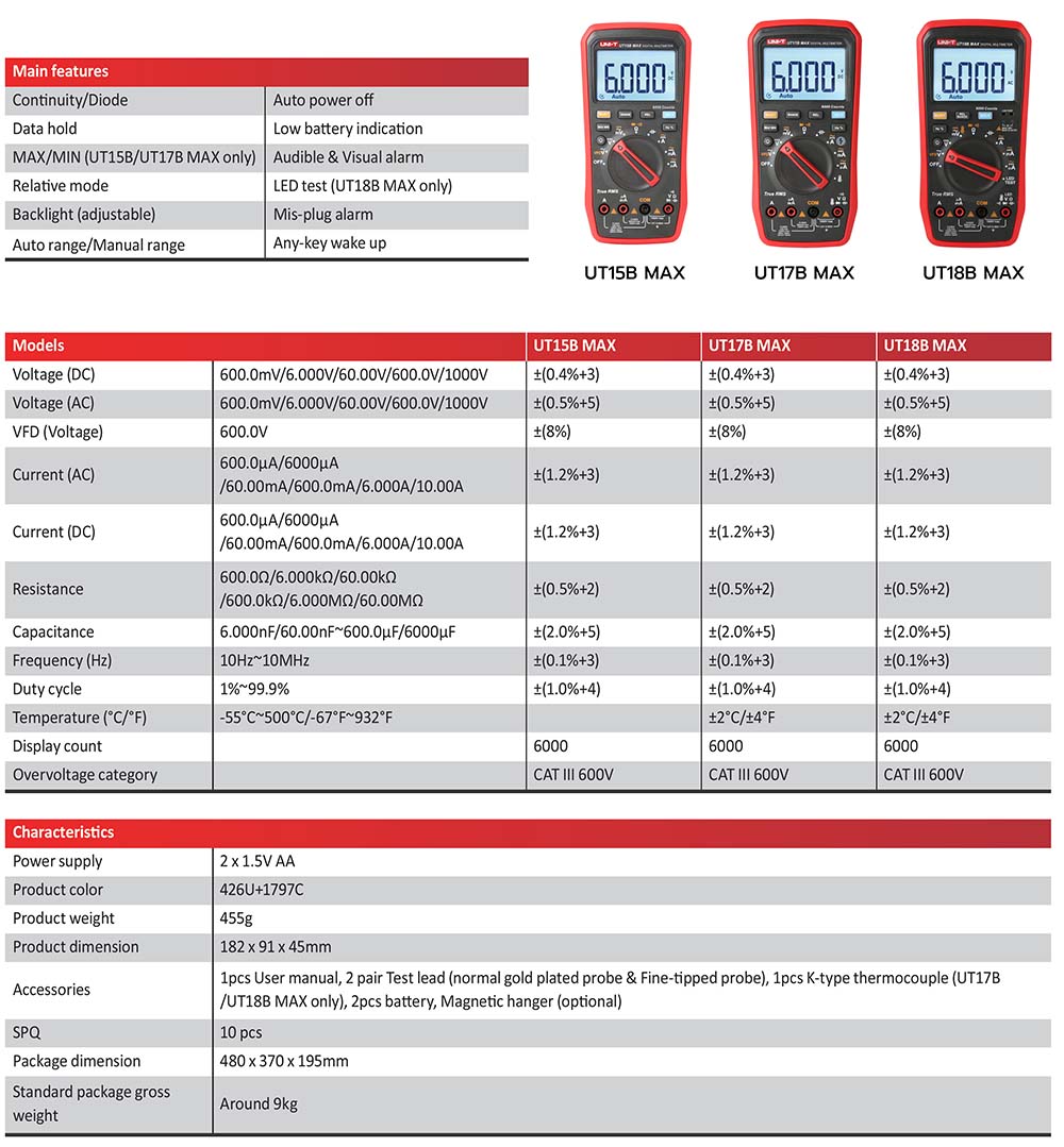 UNI-T ดิจิตอลมัลติมิเตอร์ รุ่น UT18B MAX การวัดแบบ True RMS ดีไซน์กะทัดรัด ฟังก์ชัน V.F.D ทนทานต่อสัญญาณรบกวน EMC ได้ดี
