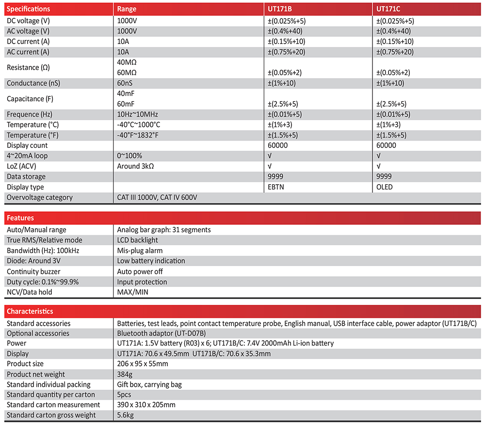 UNI-T ดิจิตอลมัลติมิเตอร์ รุ่น UT171C เป็นมัลติมิเตอร์เกรดอุตสาหกรรมที่ใช้โดยผู้เชี่ยวชาญ หน้าจอ OLED มีมุมมองกว้างและสามารถทำงานในอุณหภูมิต่ำได้