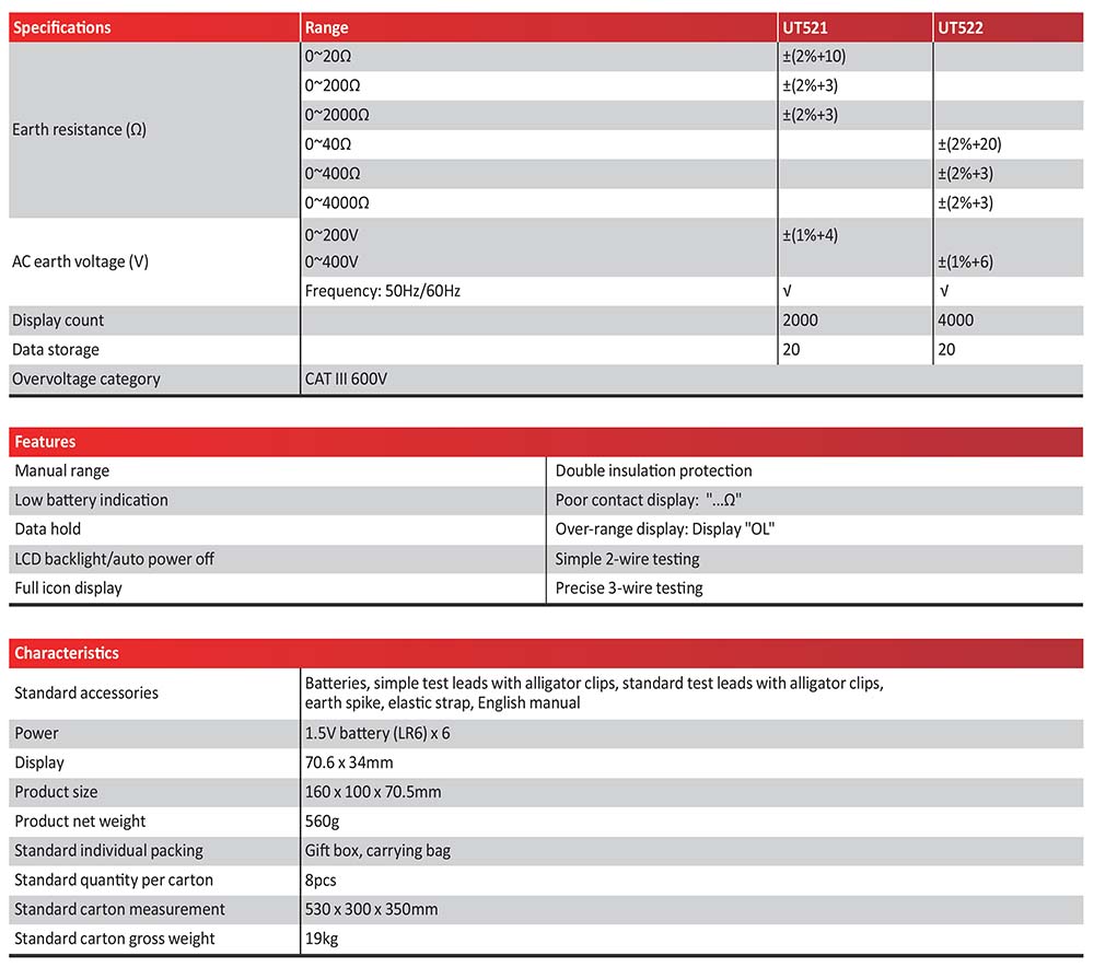 UNI-T เครื่องวัดทดสอบความต้านทานดินดิจิตอล รุ่น UT522 สามารถวัดความต้านทานดินแบบ 3 สาย และ 2 สาย ได้อย่างแม่นยำ น้ำหนักเบาที่สะดวกต่อการใช้งานภาคสนาม