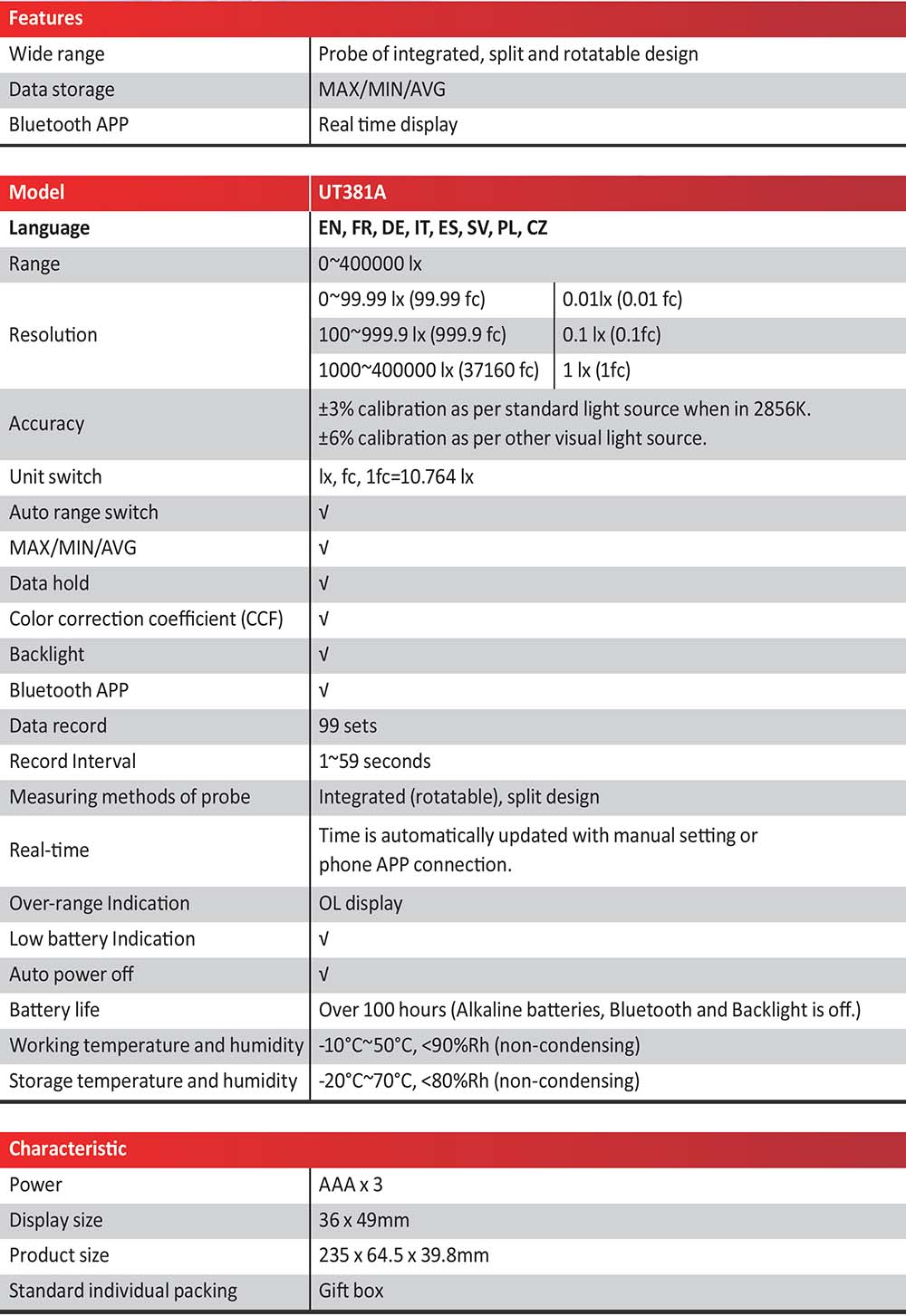 UNI-T 381A เครื่องวัดความเข้มแสง ลักซ์มิเตอร์ เชื่อม บลูทูธ มิเตอร์วัดแสง Illuminance Meter UT381A มีช่วงวัดที่กว้าง แสดงผลในหน่วยลักซ์ หรือ ฟุต