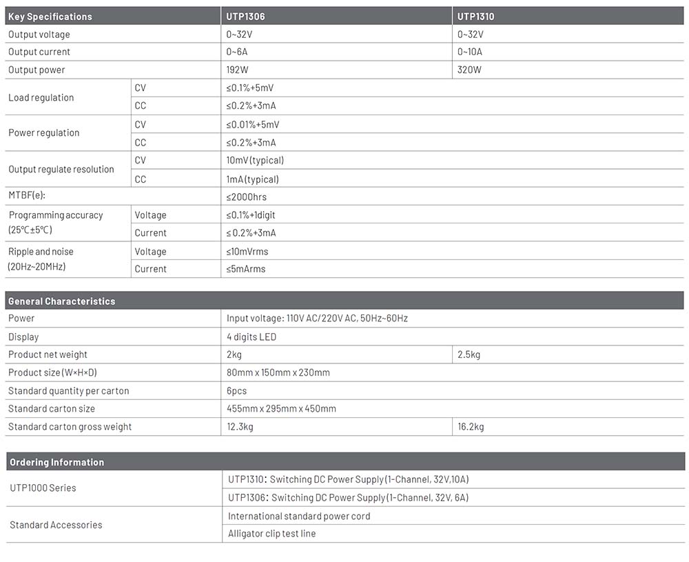 UNI-T เพาเวอร์ซัพพลายดิจิตอล จ่ายไฟ 32V 6A 192W รุ่น UTP1306 ปรับแรงดันได้ โดยมีเอาท์พุตเดี่ยว มีคุณสมบัติการจ่ายไฟที่สะอาดและประสิทธิภาพที่ยอดเยี่ยม