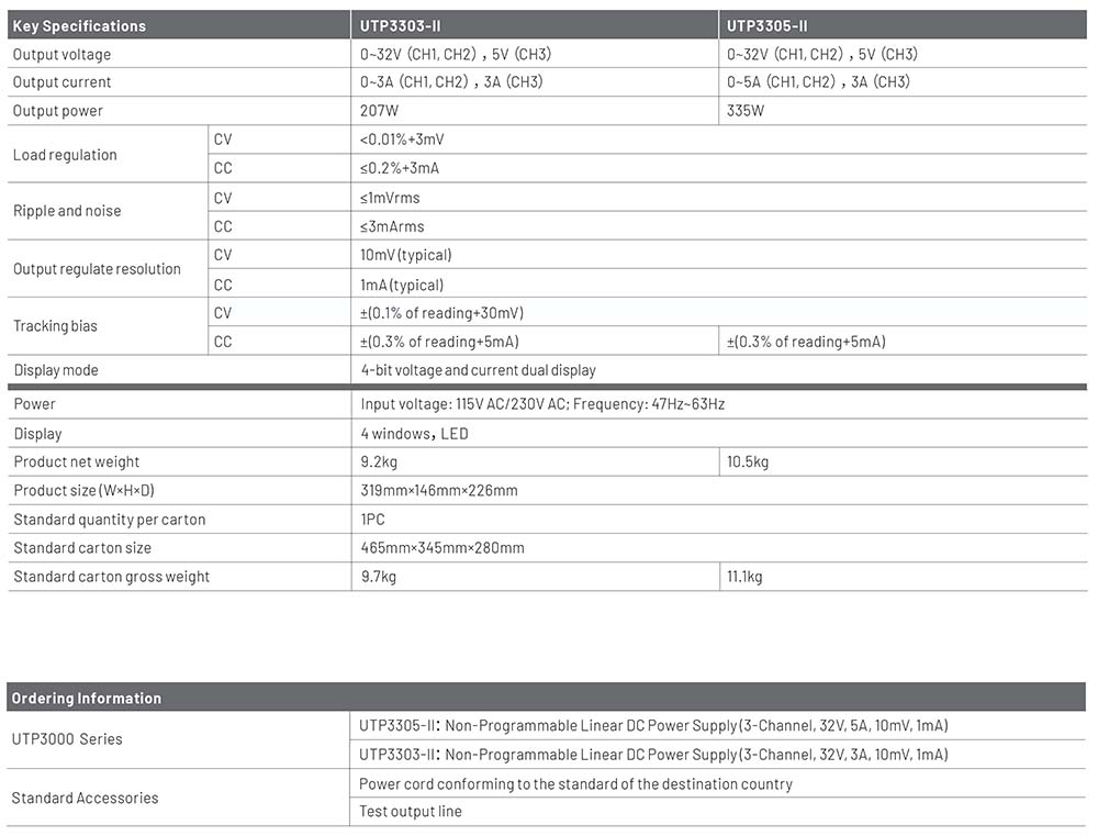• ซีรีส์ UTP3300 เป็นแหล่งจ่ายไฟ DC แบบเชิงเส้น 3 ช่องที่สามารถปรับได้ โดยมีช่องทางคู่ที่ปรับค่าได้และช่องทางเดี่ยวที่คงที่