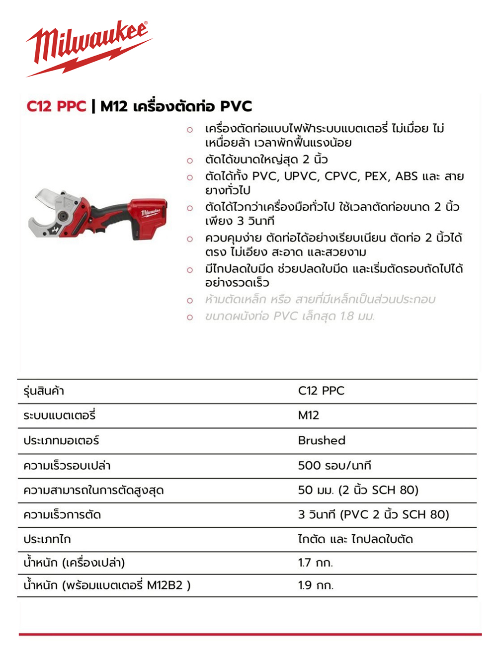 MILWAUKEE C12 PPC-0 เครื่องตัดท่อ PVC/PEX แรงกดในการตัด 175 กก./ตร.ซม. ตัดท่อ PVC ขนาดสูงสุด 50 มม. ตัดเรียบเนียน ไร้เศษครีบ