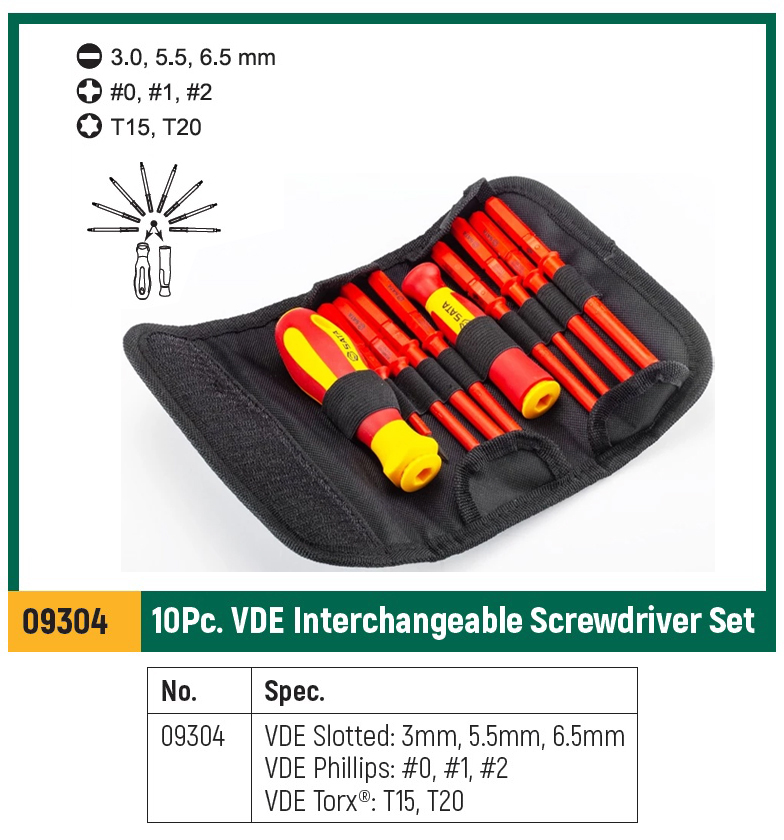 SATA 09304 ชุดไขควงกันกระแสไฟฟ้า 10 ชิ้น/ชุด ด้ามหุ้มฉนวน VDE กันไฟฟ้า 10,000 โวลต์ แกนแบบถอดเปลี่ยนได้ ชุดไขควงช่างไฟ ซ่อมไฟ