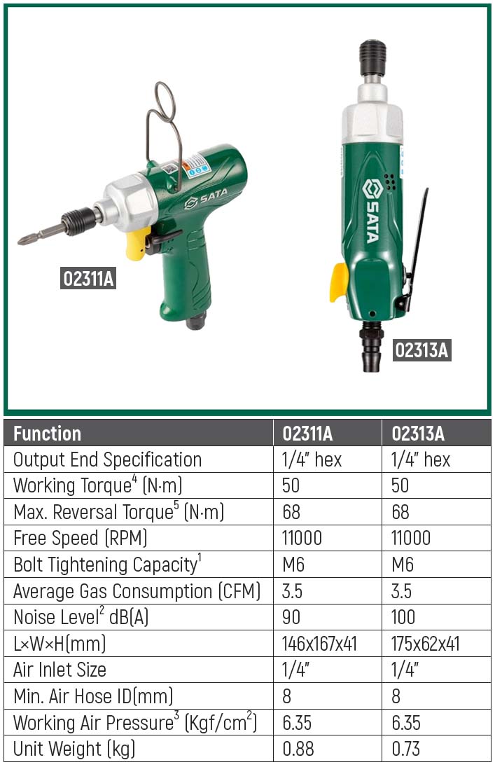 SATA ไขควงลม 1/4" HEX แรงบิด 50 Nm รุ่น SATA 02311A ขนาดเล็กสำหรับการใช้งานที่ยืดหยุ่น โครงสร้างการกระแทกแบบคู่ช่วยให้การส่งออกแรงบิดมีความเสถียร