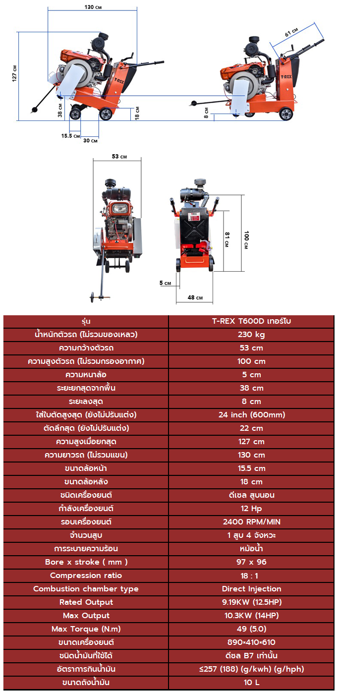 T-REX เครื่องตัดพื้น รถตัดถนนดีเซล รุ่น T-REX T600D เทอร์โบ ใช้เครื่องยนต์ ดีเซล สูบนอน ตัดกลางแดดได้นาน แรงไม่ตก