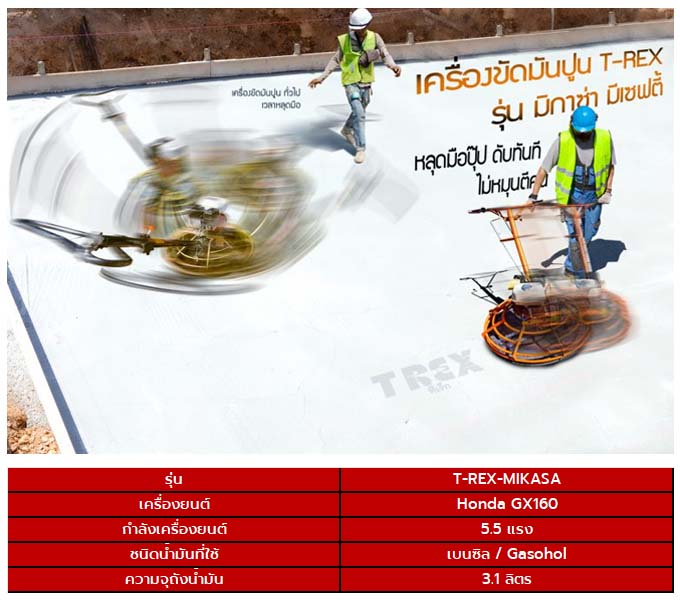 T-REX เครื่องขัดมันปูน-ปาดปูนเบนซิน 1 เมตร ทรงญี่ปุ่น รุ่น T-REX MIKASA มีระบบเซฟตี้ เมื่อเครื่องหลุดมือ เครื่องจะดับทันที ไม่หมุนตีคน
